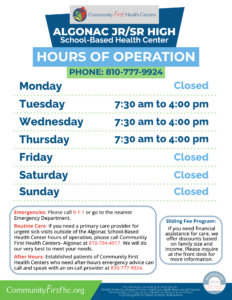 Community First Health Centers is excited to announce the opening of a School-Based Health Center inside Algonac JR/SR High School (5200 Taft Rd., Clay Township, MI 48001). This Health Center will be located right inside the school and is available to individuals between the ages of 5-21. Residency in Algonac or Clay Township is NOT required.