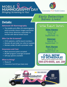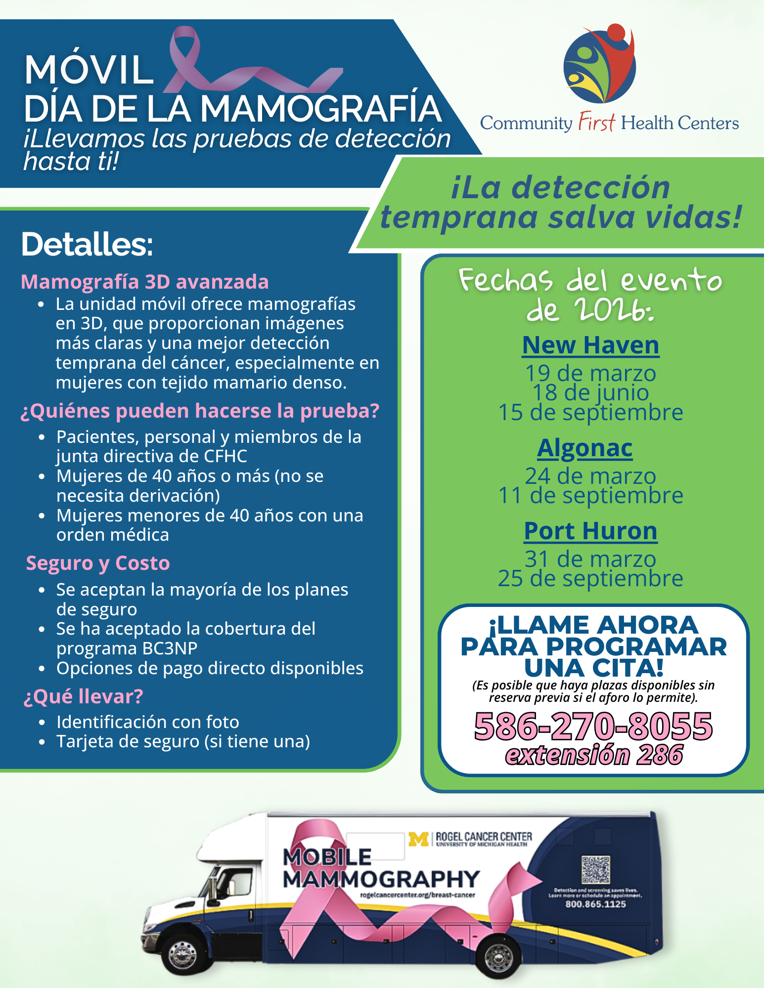 We’re excited to share that Community First Health Centers, in partnership with Michigan Medicine, will be hosting Mobile Mammography Days in 2026. This event will bring convenient breast cancer screening directly to our sites. This service is available to eligible CFHC patients, staff, and board members and supports early detection and prevention.